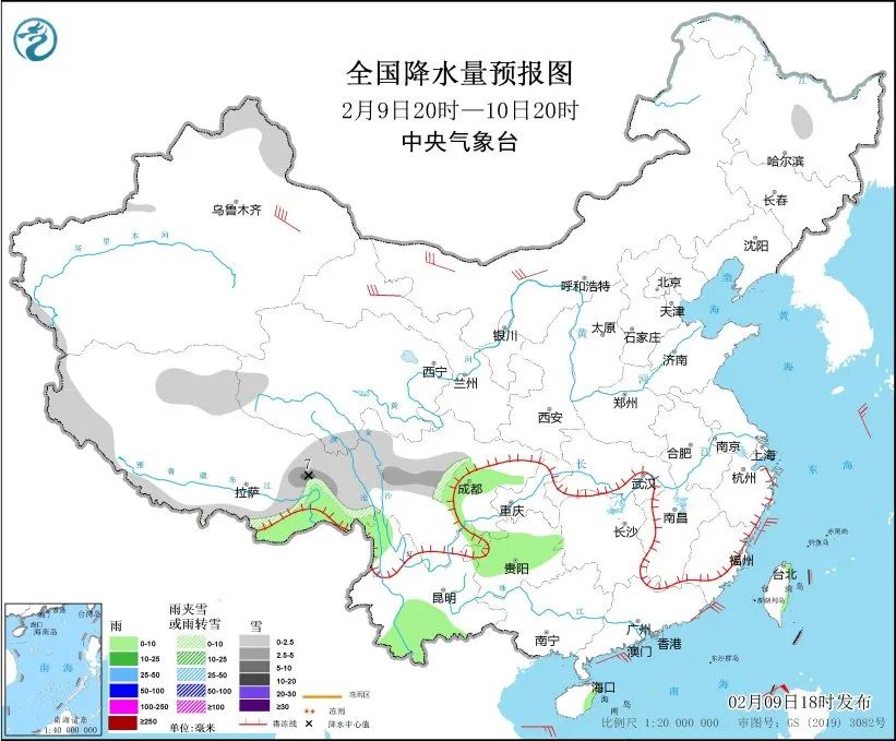- 2月9日20时至10日20时,新疆北部、西藏北部和东部、川西高原、黑龙江中部等地部分地区有小雪或雨夹雪,其中,西藏东部、川西高原北部等地部分地区有中到大雪。西藏东南部、四川盆地东部和南部、贵州中北部、云南南部、海南岛东部、台湾岛东部等地部分地区有小雨。