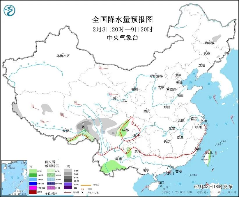 - 2月8日20时至9日20时,西藏东部和西北部、川西高原、黑龙江中南部等地部分地区有小雪或雨夹雪,其中,西藏东部部分地区有中到大雪;四川盆地西部、贵州西南部、云南中南部、台湾岛东部等地部分地区有小雨。